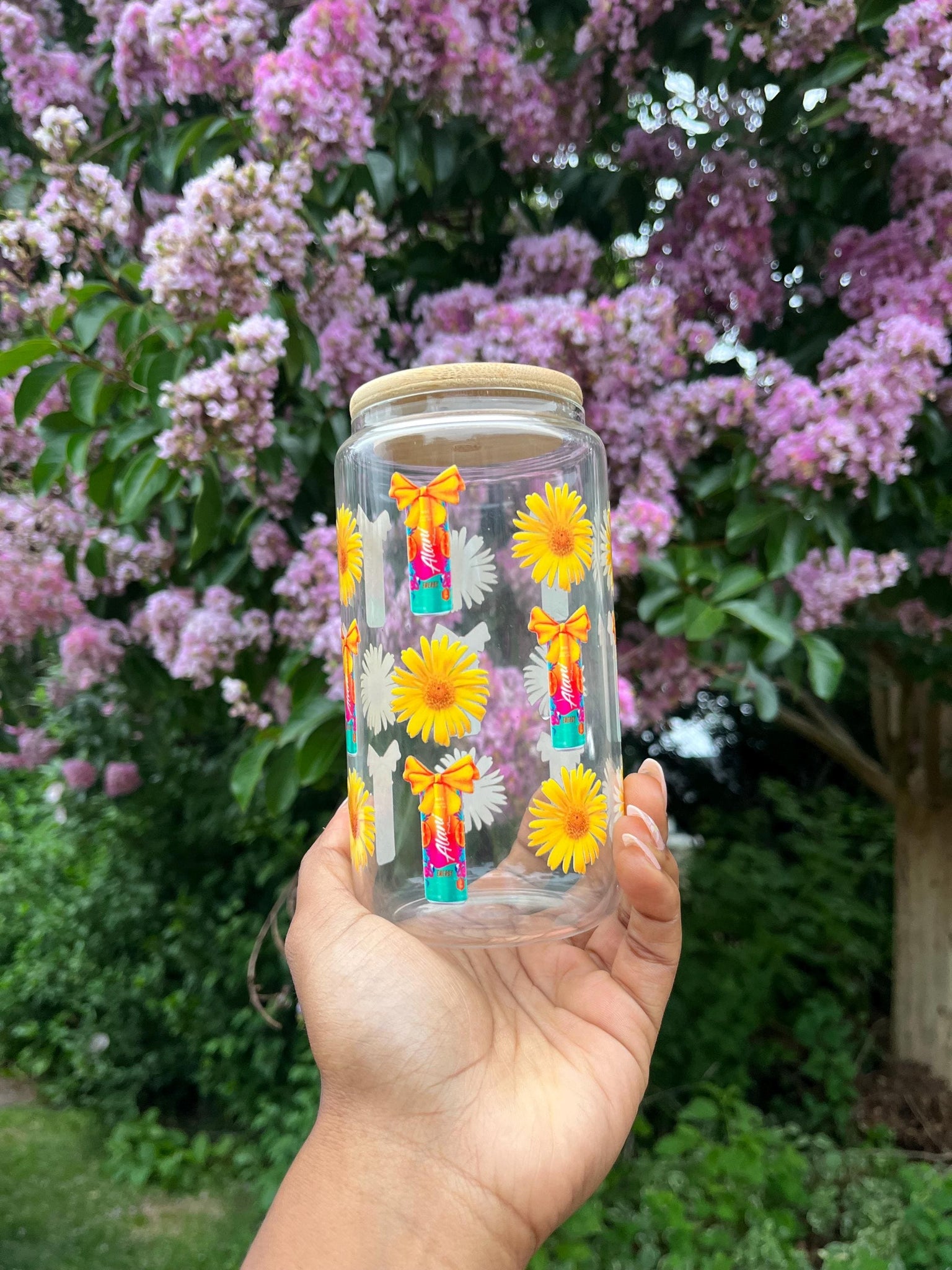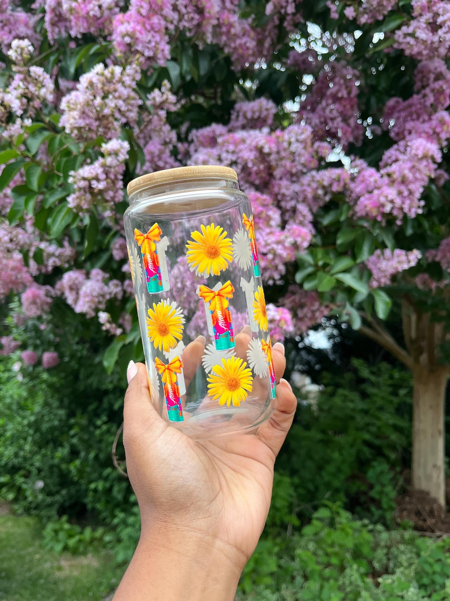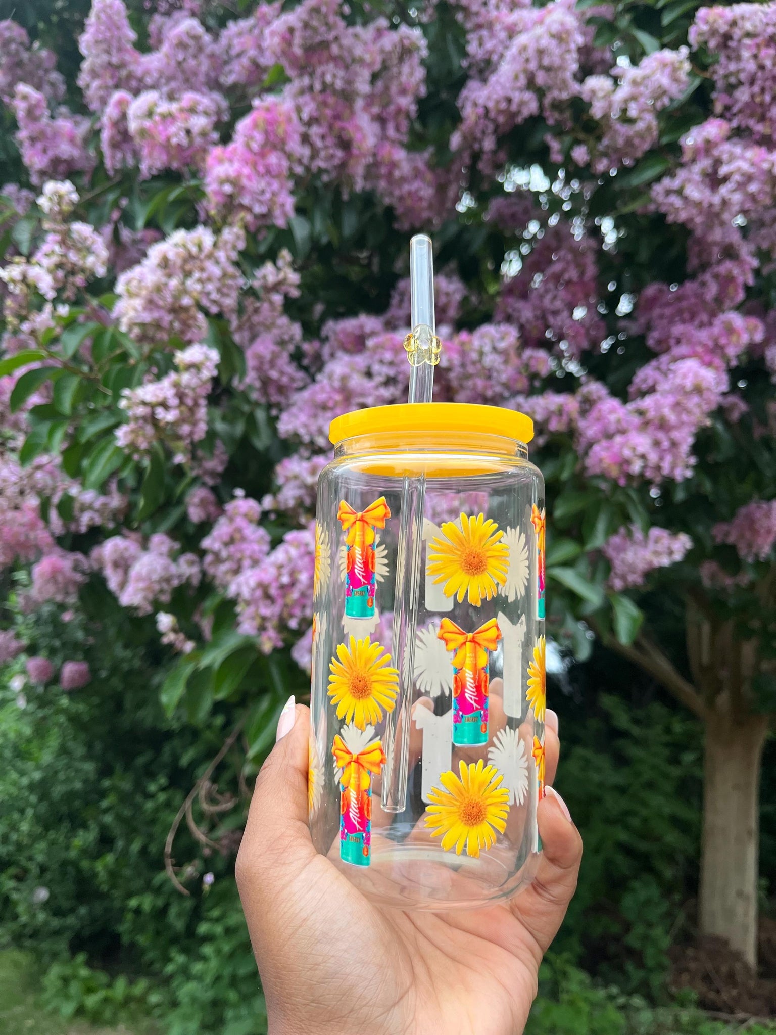 This comes with bamboo lid and plain glass straw. orange lid and flower straw is extra